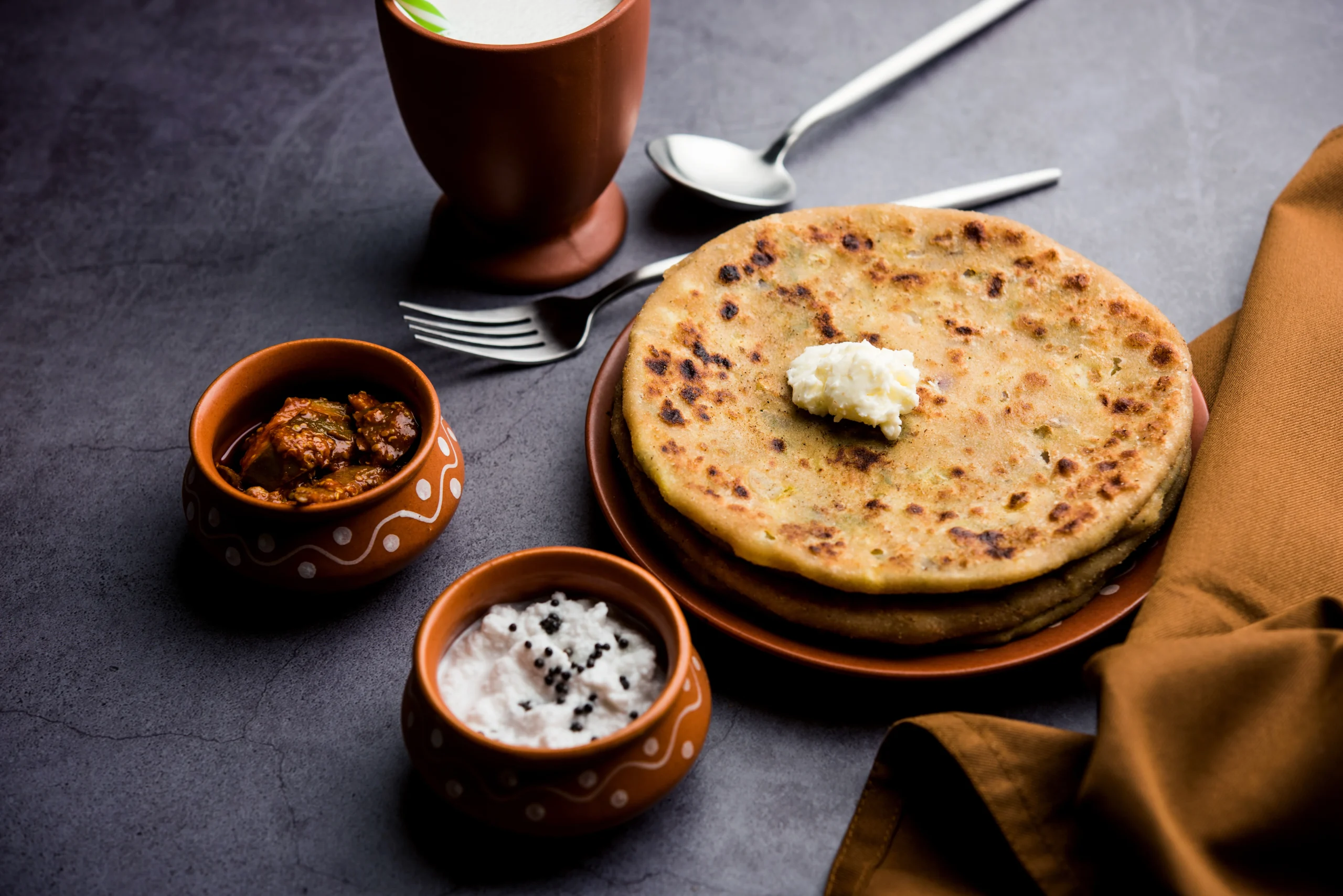 Four Pieces soft, whole-wheat paranthas stuffed with a savory mashed potato filling, seasoned with green chilies, coriander, and spices, served with curd and pickle (Extra charges).