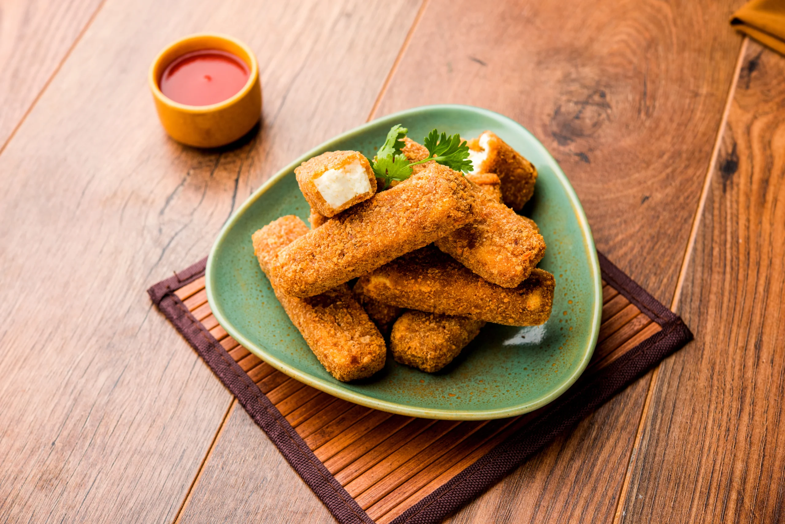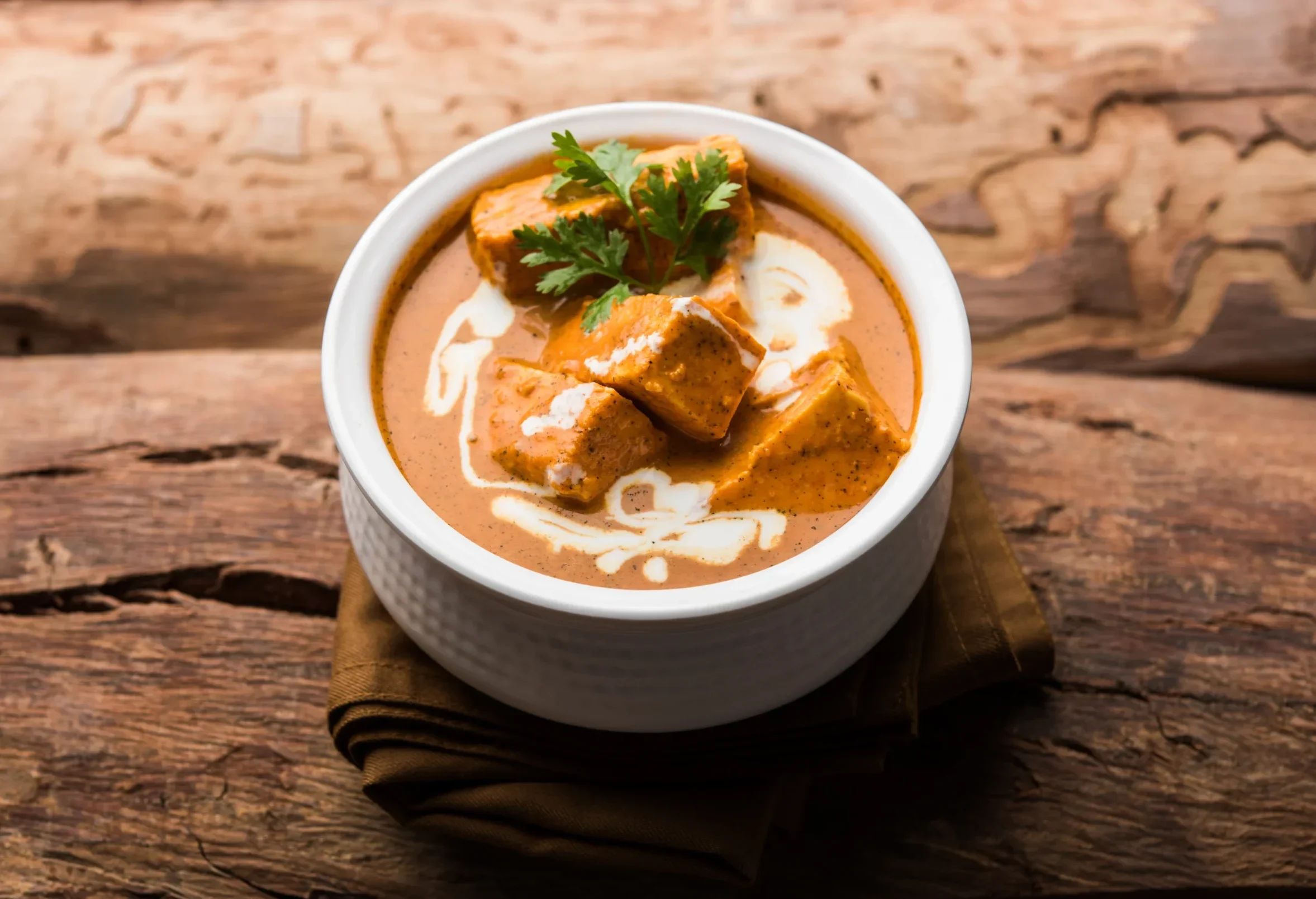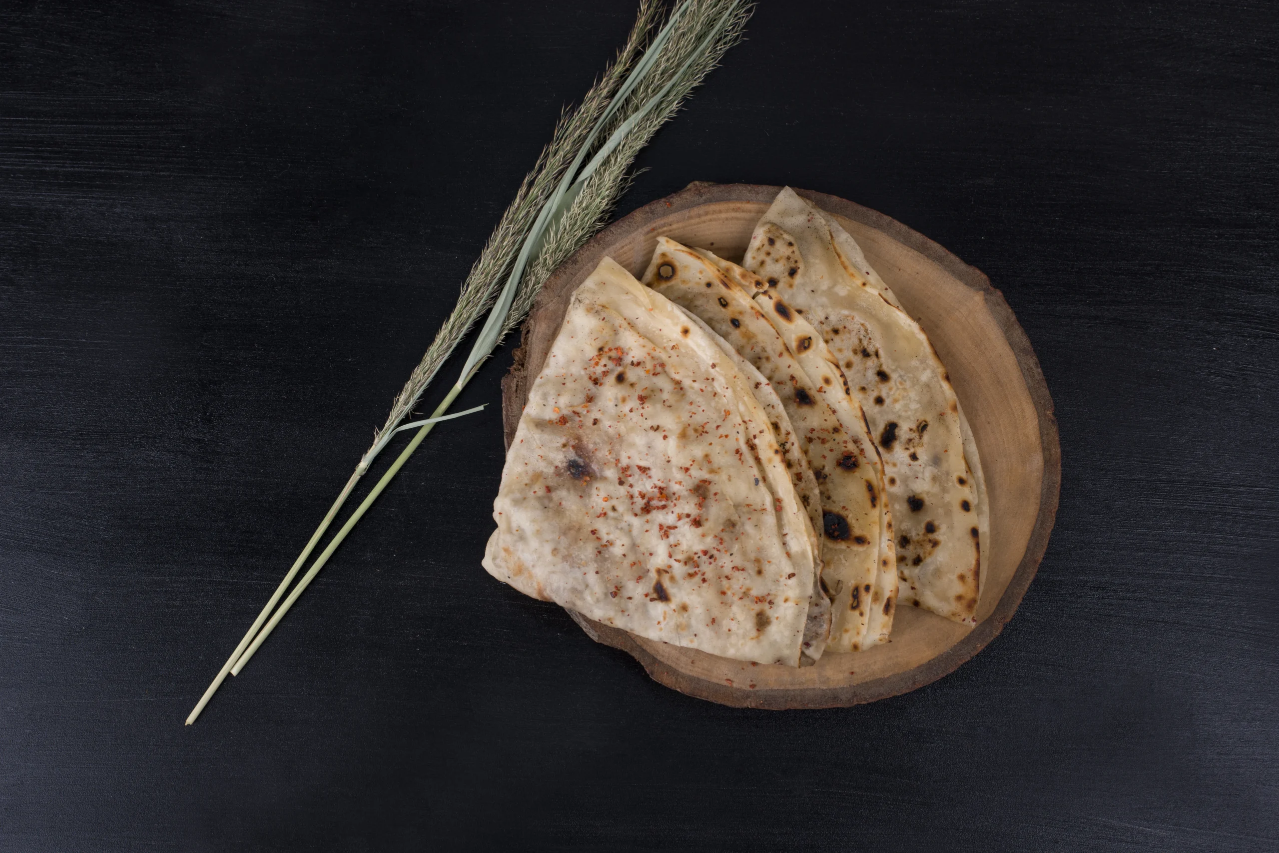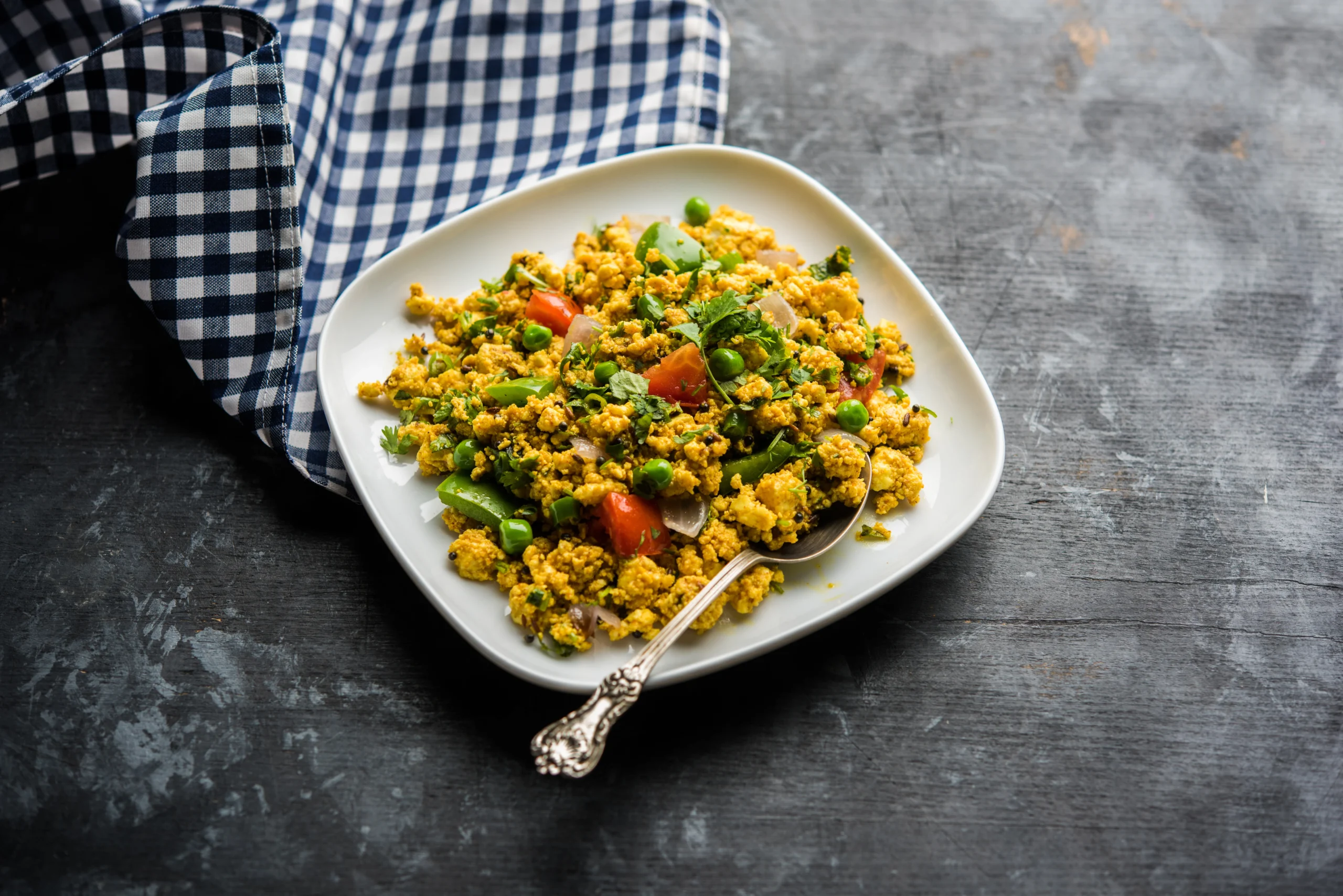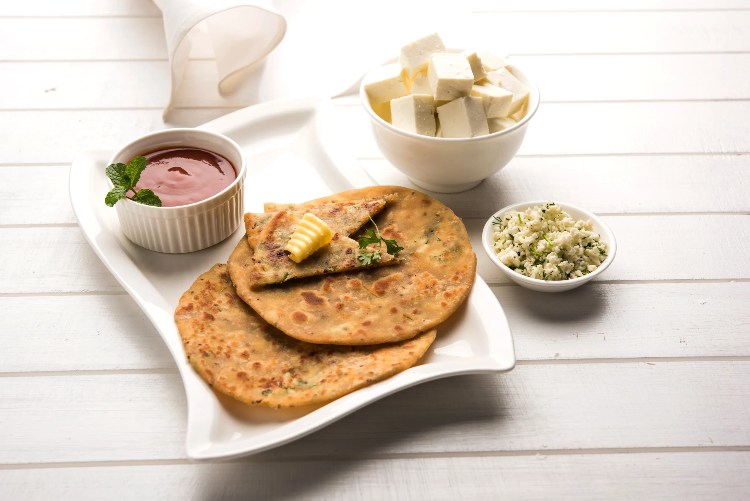 4 Pieces of flaky paranthas filled with crumbled paneer (Indian cottage cheese), mixed with onions, green chilies, and fresh herbs, served with curd and pickle (Extra charges).