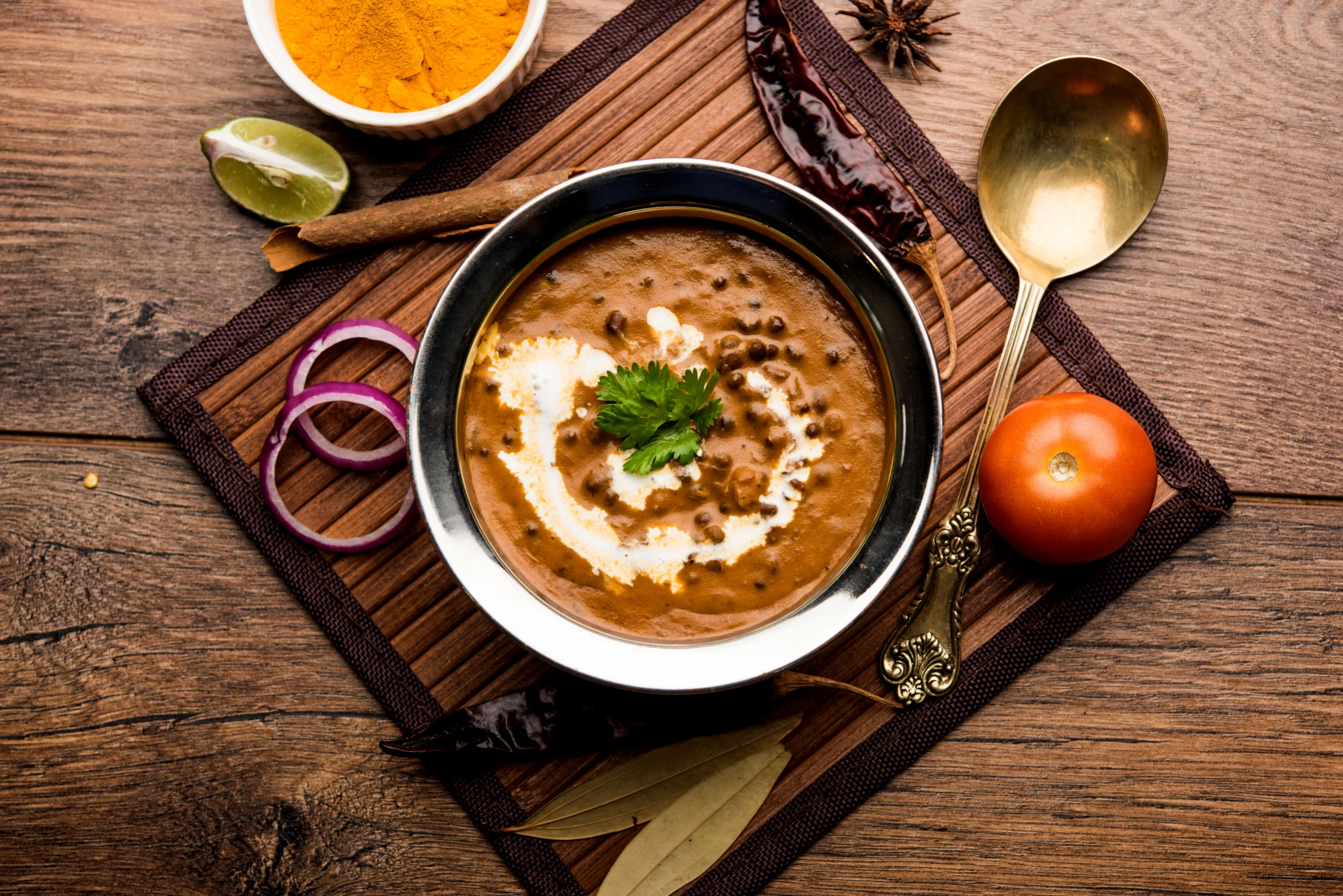 Four crispy, golden-fried puris served with a spiced potato curry made with tender potatoes, onions, tomatoes, and a blend of aromatic spices like cumin and turmeric.
